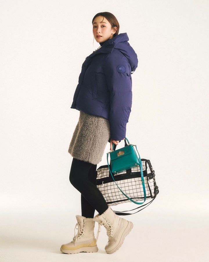 スノーブーツ¥138,600(カナダグース/カナダグースジャパン)ダウンコート¥176,000(カナダグース/カナダグースジャパン)タートルニット¥34,100(スローン/ザショップ スローン 新静岡セノバ店)シャツ¥29,700(ルル・ウィルビー/アルアバイル)スカート¥17,600(マイストラーダ/マイストラーダ プレスルーム)ピアス¥46,200(アガット)タイツ¥5,500(ブルーフォレ/リトルリーグ インク)ショルダーバッグ¥71,500(フルラ/フルラ ジャパン)バッグ¥23,100(レスポートサック/レスポートサック ジャパン)