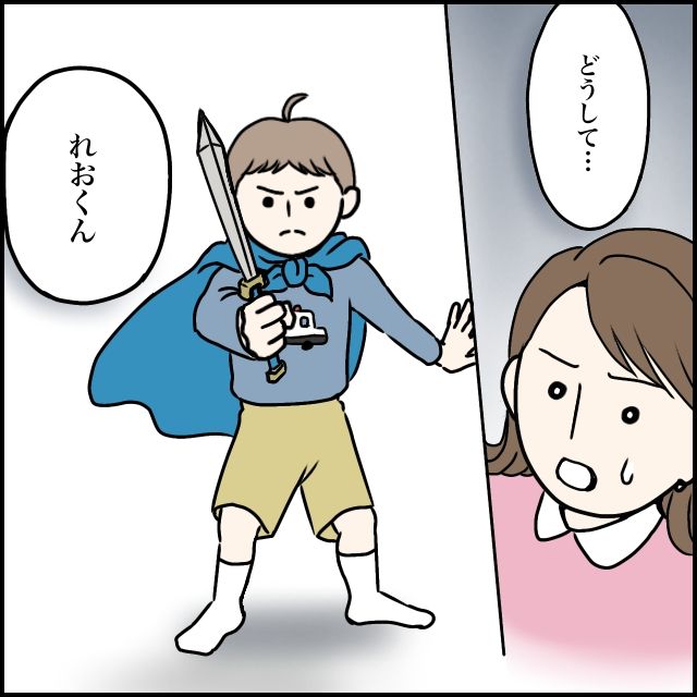 「どうして・・・れおくん」私を背後から叩いた人物は、玲美さんの息子れおくんでした。首にマントを巻き、おもちゃの剣を構えたれおくんは、まるで正義のヒーローのよう。彼の姿を見て、私はおもちゃの剣で叩かれたのだと察しました。