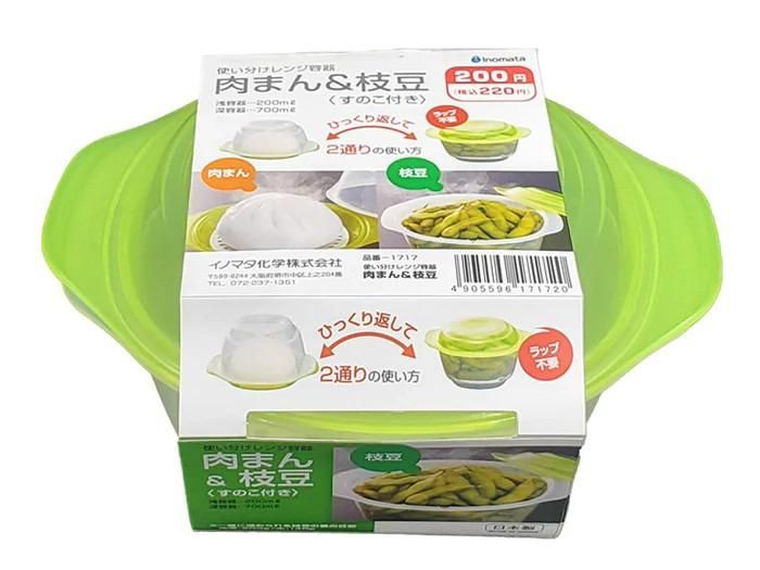 変わり種として注目なのが、肉まんと枝豆の調理を使い分けできるレンジ対応容器。容器をひっくり返すだけで蓋の深さが変わり、それぞれに最適な加熱ができるのが特長です。すのこ付き設計で余分な水分を落としながら温められるので、電子レンジ調理でもふっくら仕上がります。