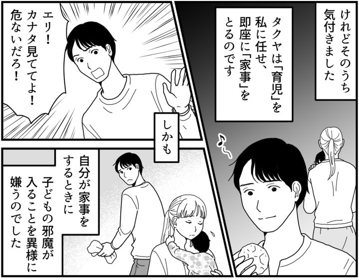 私(エリ)は、夫のタクヤと息子のカナタ(2才)との3人暮らしをしています。私は結婚前からタクヤの家事能力の高さに驚かされていました。タクヤは家事がとても好きだったようで、料理も洗濯も掃除もきっちり完璧にこなしていたのです。子どもができても仕事を続けたいと思っていた私にとっては理想的な結婚相手でした。それなのに、カナタが生まれてから私たちの歯車は狂いはじめるのです。私は次第にその言動に違和感を抱くようになり……?