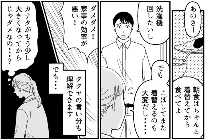 子育てよりも家事を優先するタクヤ。家事に関しては感謝はしているし、ありがたいということも伝えてはいます。ただ日に日に嫌悪感が募ってしまうのでした。だってタクヤは完璧な「家事」しか見ていないから……。