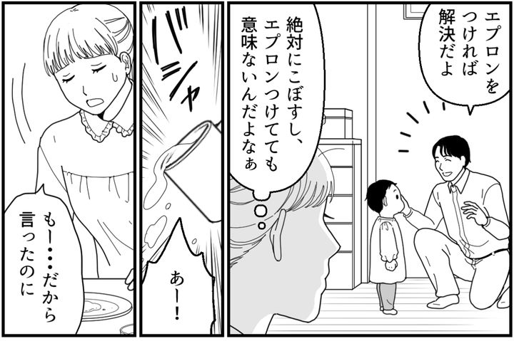 家事に効率を求めるタクヤの言い分も理解できます。でも、カナタがもう少し大きくなってからじゃダメなのでしょうか。たとえ袖までついている食事用エプロンを着せても、自分で食べたがる時期のカナタは派手にこぼすし汚します。