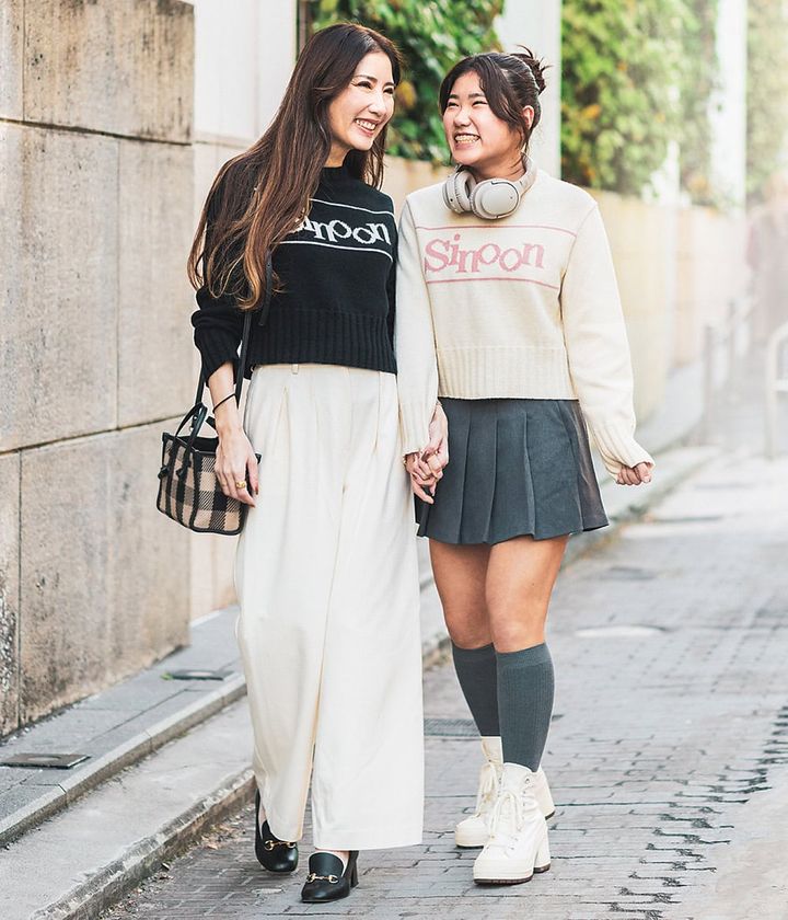 色違いのロゴニットはママはモノトーンで大人の落ち着きを。娘は明るいニットにミニスカで若さ溢れるJKスタイルに。それぞれの着こなしを満喫。Mardi MercrediやMartin Kimなど他にもシェアできるものを所有。