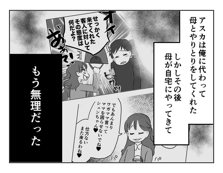 俺(シュンスケ)は、妻のアスカと息子のソウタとの3人暮らしだ。俺は幼い頃に父親を亡くして、ずっと母と2人で暮らしてきた。ここまで育ててくれた母には感謝している。けれど……母の顔色を伺い続けた子ども時代。成長するにつれて「もしかしたらウチの親は普通の親とは違うのかもしれない」と思いはじめた。アスカに対しても母さんはグイグイ自分のことばかり。このままだと自分の家庭までも母さんに壊される……俺は母さんと距離を置く決断をした。ひとまず俺が母さんと連絡を取ることはなくなったんだ。