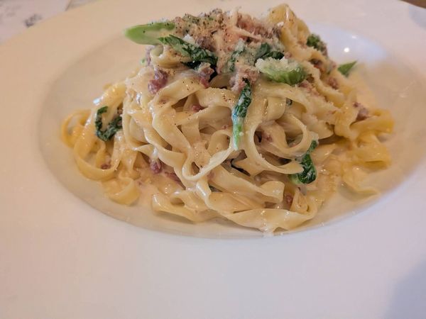 これも生麺にして正解!こちらは平たい麺で、クリームがしっかり絡んでおいしい。
