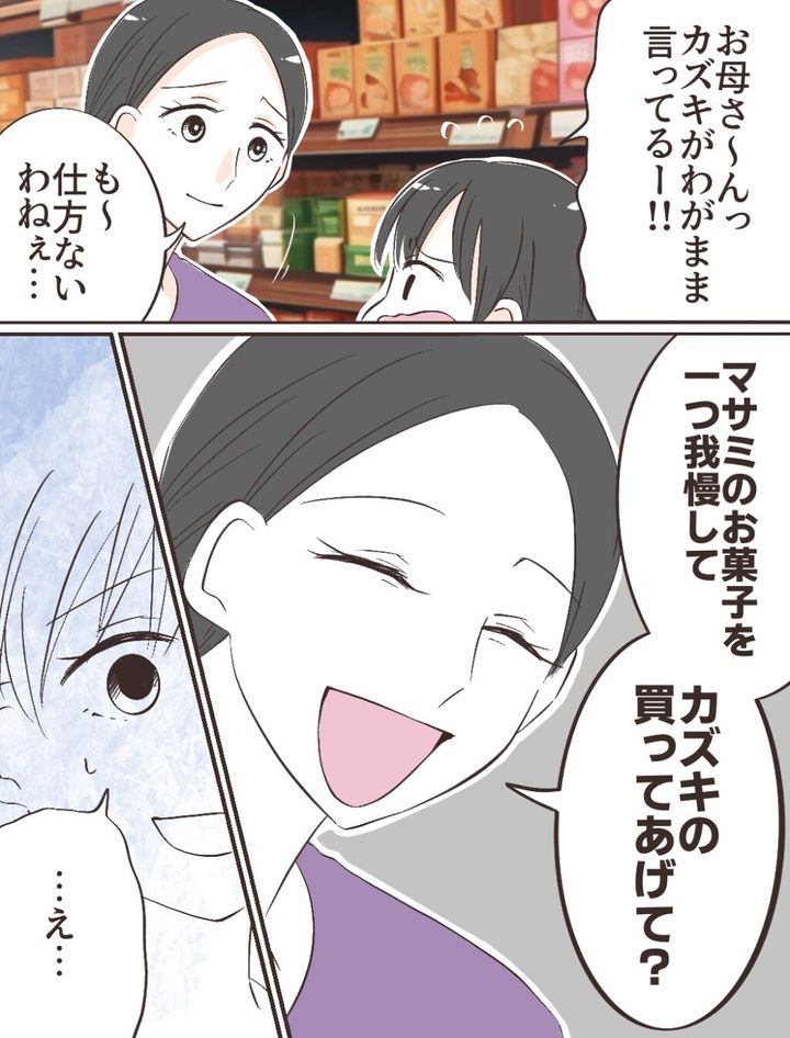 埒が明かなくなった私は「お母さ~んっ、カズキがわがまま言ってる!」と母に助けを求めます。すると母は「も~仕方ないわねぇ」と困ったようにつぶやき、私に笑顔を向けて「マサミのお菓子を一つ我慢して、カズキの買ってあげて?」と言いました。予想外の返答に、私は思わず固まってしまいます。