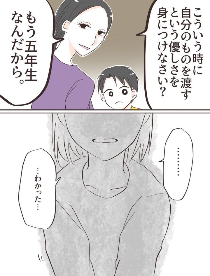 「こういう時に自分のものを渡す優しさを身につけなさい?もう5年生なんだから」母にそう言われた私は、胸の奥に湧き上がった感情をぐっと飲み込んで「・・・わかった」と小さくつぶやきました。