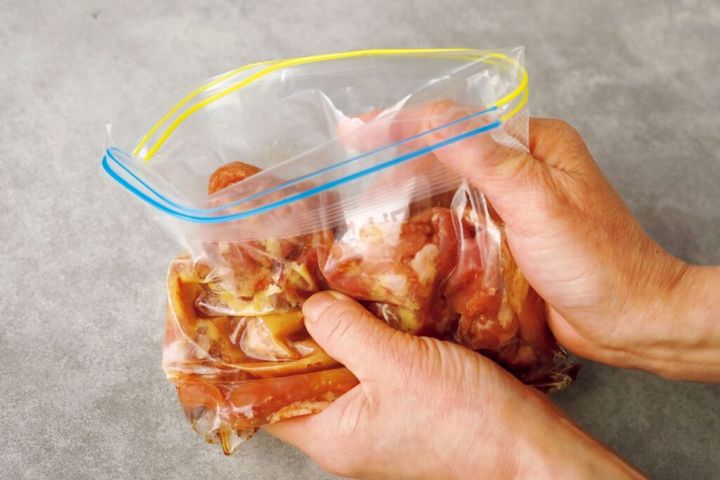 保存袋は開けた状態でもむと、まんべんなく調味料や油が混ざります。中身がこぼれないように注意して。