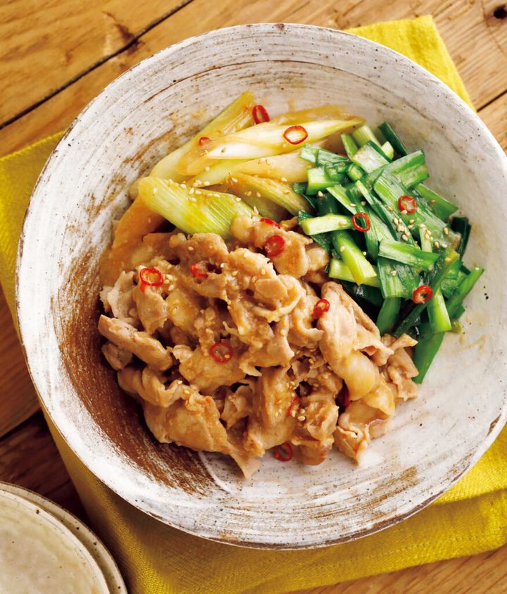 (1)にらは長さ3~4cmに切る。ねぎは斜めに長さ3~4cmに切る。直径20cmのフライパンに「下味肉」を広げ入れ、ねぎをのせて水1/2カップを注ぐ。