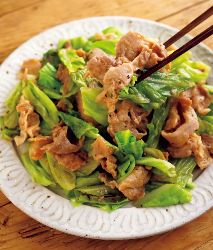 キャベツは5cm四方に切る。フライパンに「下味肉」を広げてキャベツをのせ、ふたをして中火にかける。肉に焼き色がつくまで4~5分蒸し焼きにする。ふたを取ってバター10gをのせ、かるくほぐしながら1~2分炒める。器に盛り、粗びき黒こしょう適宜をふる。