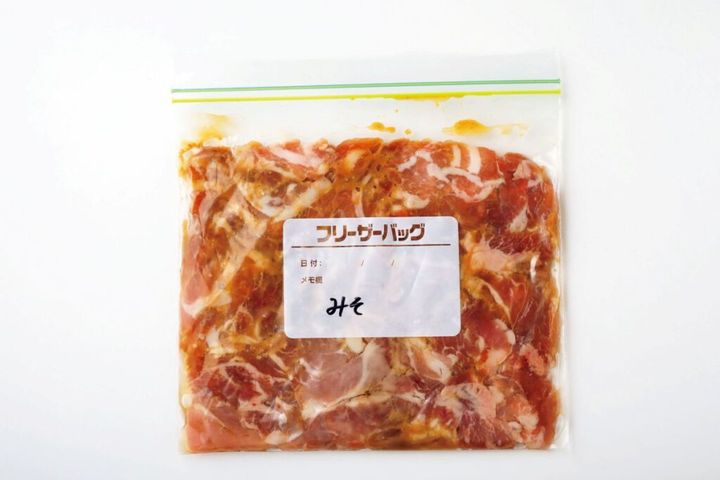 Mサイズの冷凍用保存袋に豚こま切れ肉200ɡ、みりん、ごま油各大さじ1、砂糖、片栗粉各小さじ1、みそ小さじ4を入れ、袋の上からかるくもんで混ぜる。ごま油大さじ1を加えてもみ混ぜる。保存袋の空気を抜き、薄く平らにしてから袋の口をしっかりと閉める。