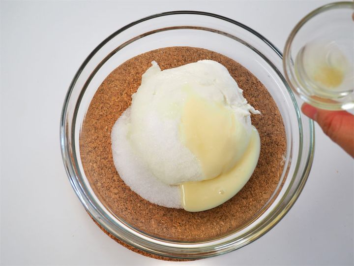 4. ケーキを冷ます間に、ボウルに水切りヨーグルト、[B]を混ぜてフロスティングを作る。
