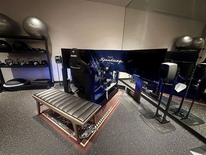 フィットネスジムの一角には、リアルなグラフィックスの本格的なレーシングシミュレーターが!大人もハマる臨場感たっぷりのマシンです。