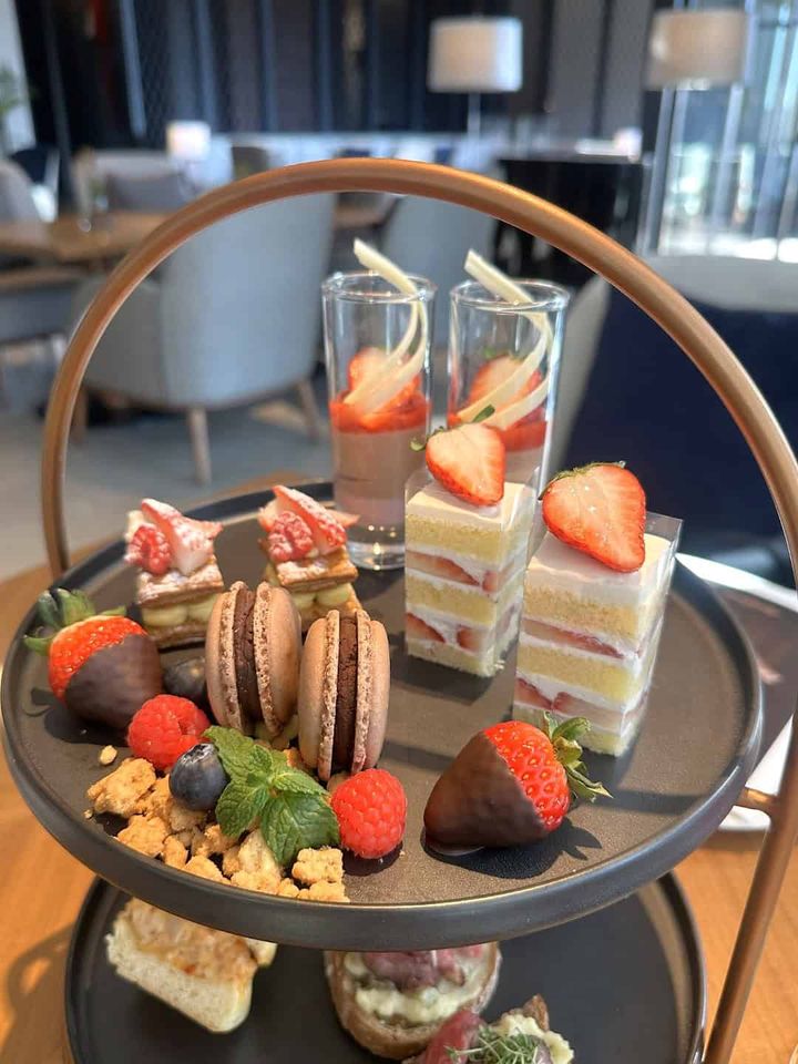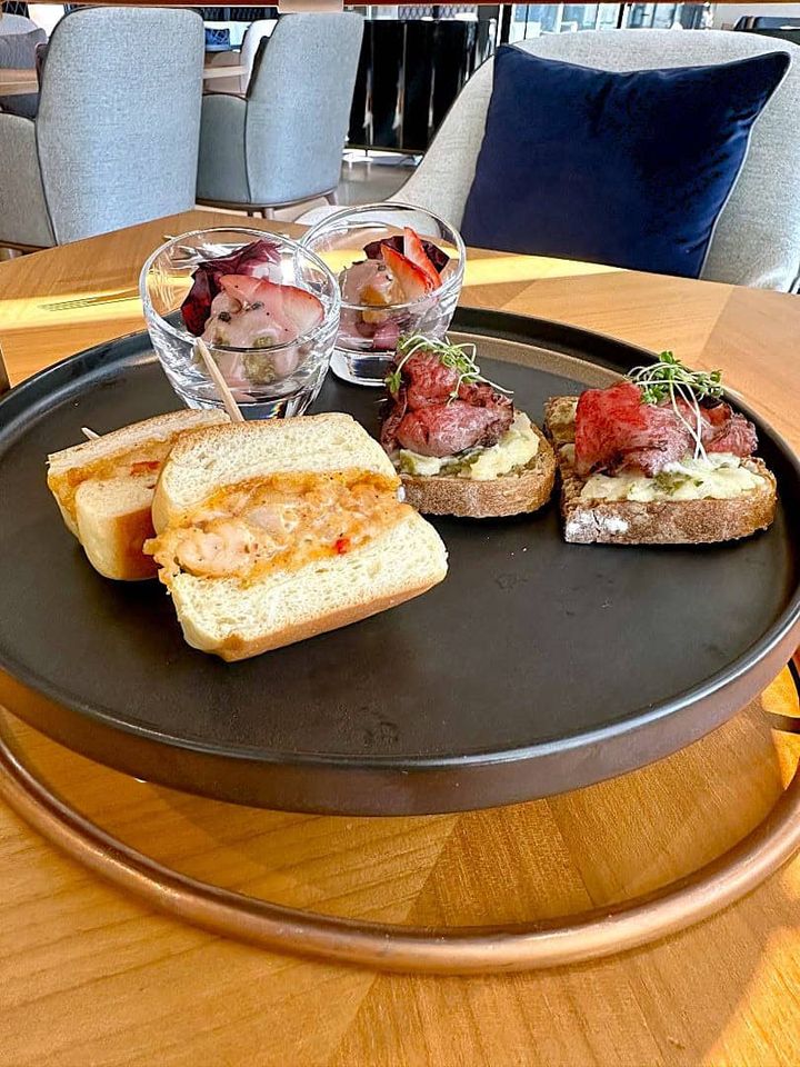 下段は充実のセイボリー。ロブスターとシュリンプをバターで低温調理しミルクパンで挟んだサンドイッチ、丁寧に火入れした和牛ローストビーフをなめらかなポテトサラダと合わせたオープンサンド、フレッシュなイチゴをトッピングしたフジアトランティックサーモンのマリネが並びます。