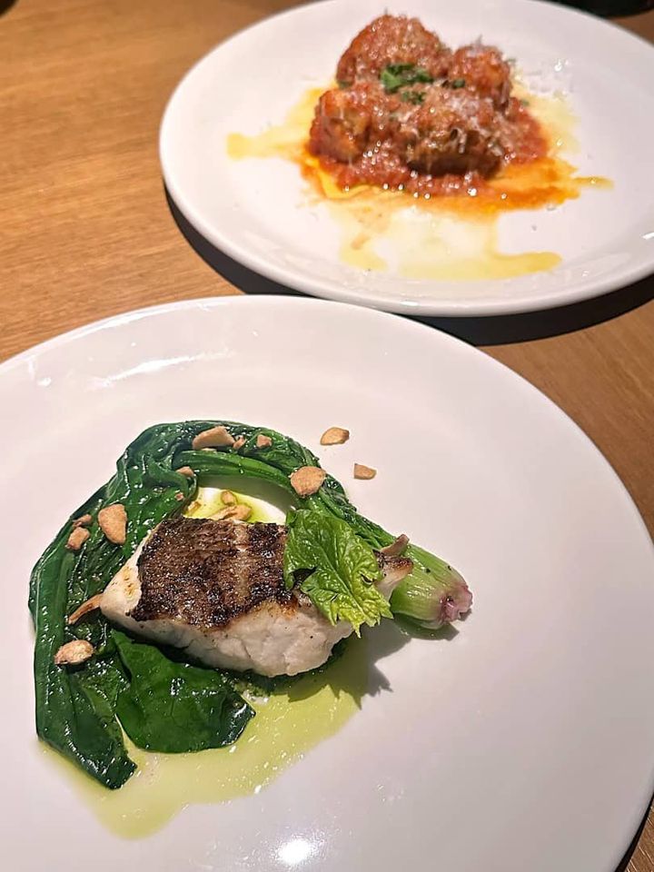 左:本日の鮮魚のグリルガーリック風味のほうれん草サルサベルデ、右:イタリア風ミートボールポルペッティと黒豚のサルシッチャパルミジャーノ・レッジャーノ