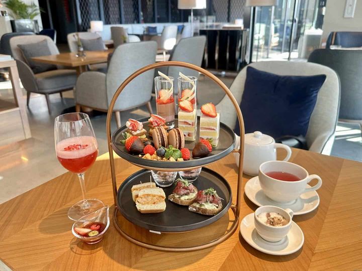 ウェルカムドリンクに始まり、濃厚なベリーソースで“味変”も楽しめるショートケーキやサクサクのミルフィーユなど、華やかなスイーツ4種がティースタンドにずらり。注目は、石井総料理長が手がけるセイボリー。ロブスターのサンドイッチや和牛ローストビーフのオープンサンド、素材の旨味と香りを凝縮したマッシュルームクリームスープなど、冬の味覚を凝縮した逸品が並びます。