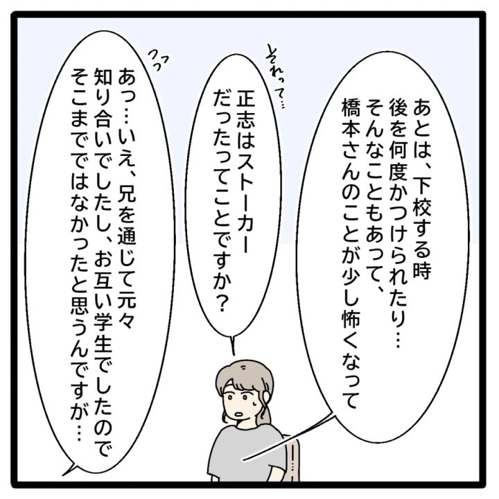 それだけでなく、下校時に何度か後をつけられたこともあったようで、正志のことが怖くなってしまったそう。私が「それって、正志はストーカーだったってことですか?」と尋ねると、聡子さんは慌てたように首を振り、「あっいえ、兄を通じて元々知り合いでしたし、お互い学生だったのでそこまでではなかったと思うんですが・・・」とフォローするように言いました。