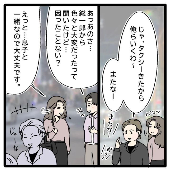そうこうしているうちにタクシーが到着し、総一郎さんと聡子さんは実家に帰ることに。すると横から正志が「あっあのさ、総一郎から色々と大変だったって聞いたけど・・・困ったことない?」と声をかけてきました。聡子さんは、急に話しかけられて内心驚いたものの「えっと、息子と一緒なので大丈夫です」と他人行儀に答えたそうです。