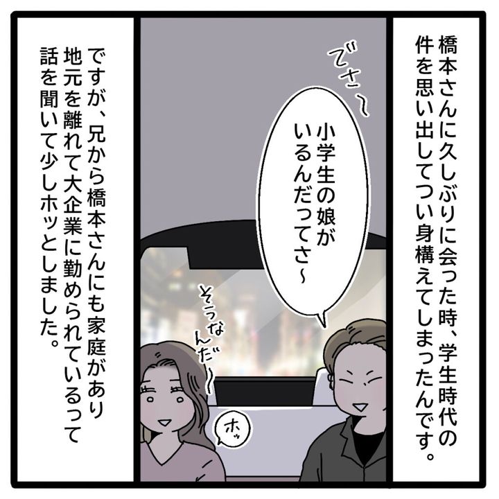 聡子さんは、正志に久しぶりに会った時、学生時代の件を思い出してつい身構えてしまったそうです。だけど、総一郎さんから正志にも家庭があり、地元を離れて大企業に勤めていると聞き、ホッとしたと話しました。