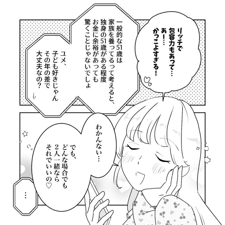 アキは幸せに浸りきっている私を現実に引き戻すように「独身の51歳がある程度お金に余裕があることは驚くことじゃないでしょ、ユメ子ども好きじゃん、その年の差で大丈夫なの?」と冷静に言いました。しかし、今の私にそんな言葉は響きません。「わかんない・・・でも、どんな場合でも2人一緒ならそれでいいの」そう言って、うっとりと微笑みました。