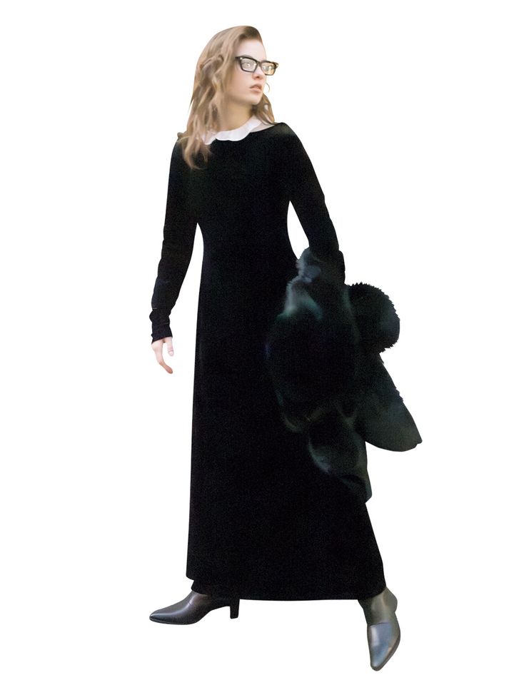 スタイルが自然とキレイに見える、上半身はスリムでスカート部分はわずかに広がるシルエット。装飾はベロアの質感とすそのニュアンスのみの潔さ。ちょっとしたパーティなど、フォーマルな場面でも頼れるミニマルだけど適度な存在感も残せる黒。