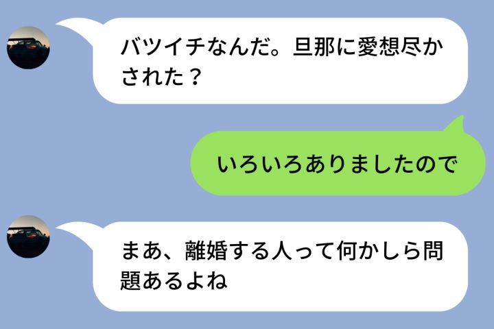 「バツイチなんだ。旦那に愛想尽かされた?」。冗談のつもりなのか、本気なのかわかりません。でも、笑えませんでした。私は短く「いろいろありましたので」とだけ返しました。すると次に届いたのは「まあ、離婚する人って何かしら問題あるよね」という言葉。胸の奥がチクリと痛みました。