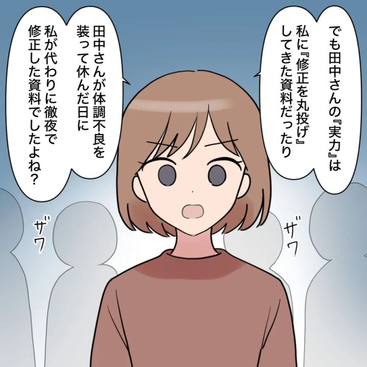 「でも、田中さんの『実力』は私に『修正を丸投げ』してきた資料だったり、田中さんが体調不良を装って休んだ日に私が代わりに徹夜で修正した資料でしたよね?」とひとつひとつ事実を挙げていきました。私の言葉に周りの保護者がざわつき始めました。