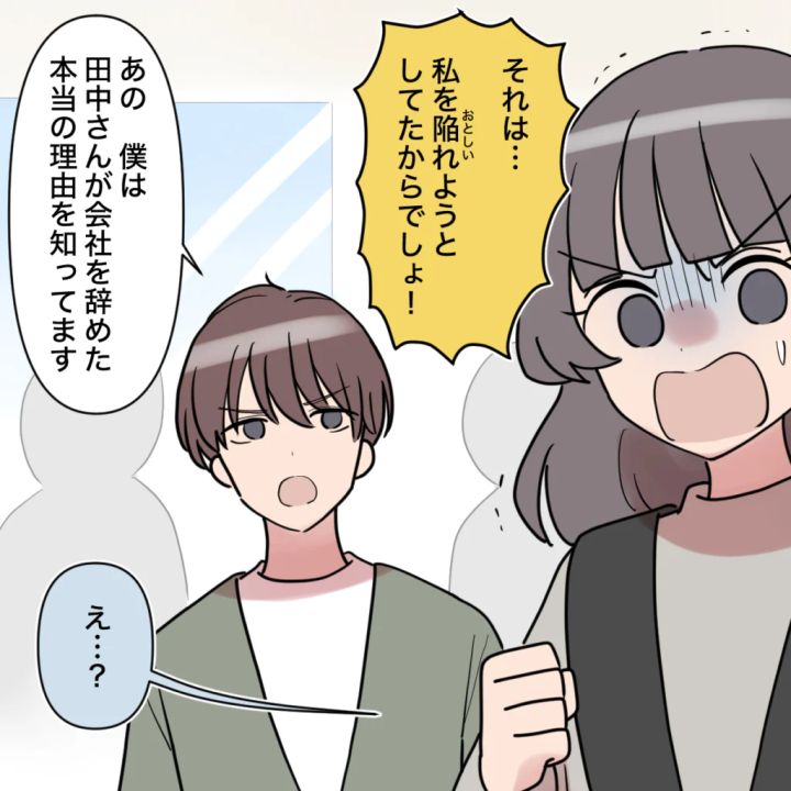 田中さんは焦りながらも「それは・・私を陥れようとしてたからでしょ!」と自分は被害者だという姿勢を崩さず反論しましたが、健太が「あの、僕は田中さんが会社を辞めた本当の理由を知ってます」と言うと、「え・・?」と急にさっきまでの勢いがなくなりました。