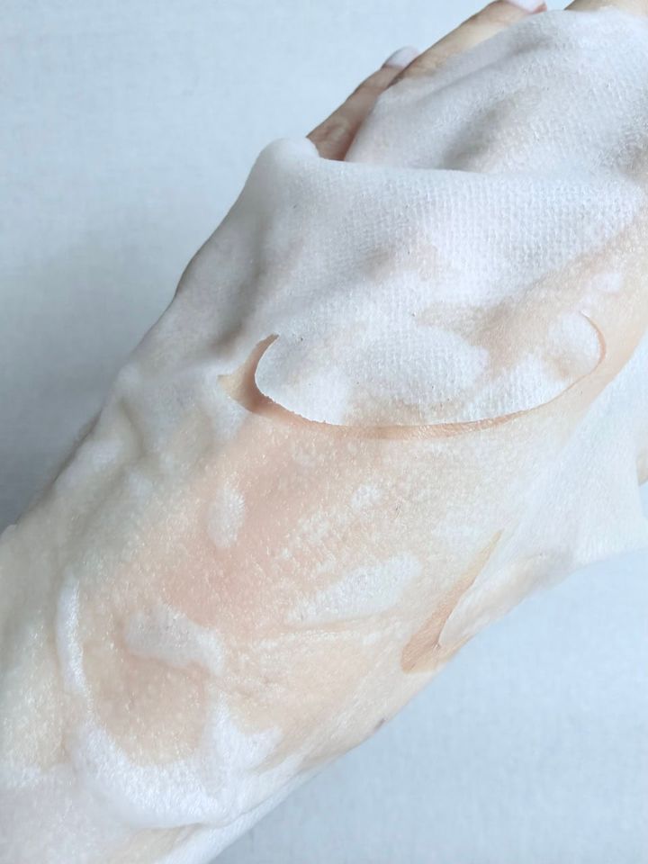 シートは薄手で扱いやすく、貼るのもとても簡単。しっとり柔らかく、肌にぴたりと密着してはがれにくいので、貼ったままコーヒーを淹れるなどの朝の準備も問題なくこなせます。とにかくみずみずしく快適な使用感がやみつきで、寒い日でも思わず手が伸びる一枚です。