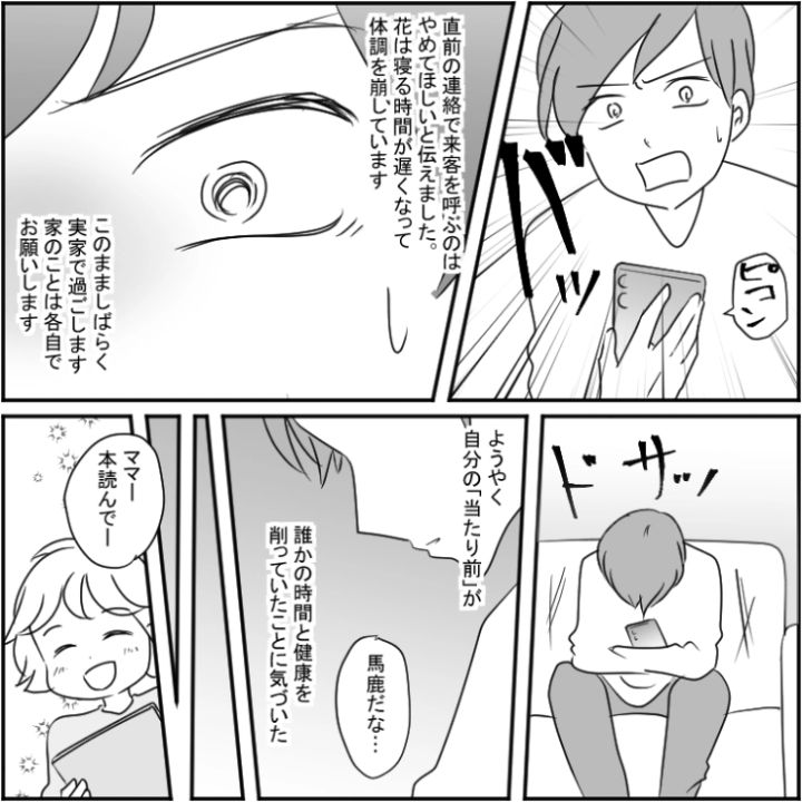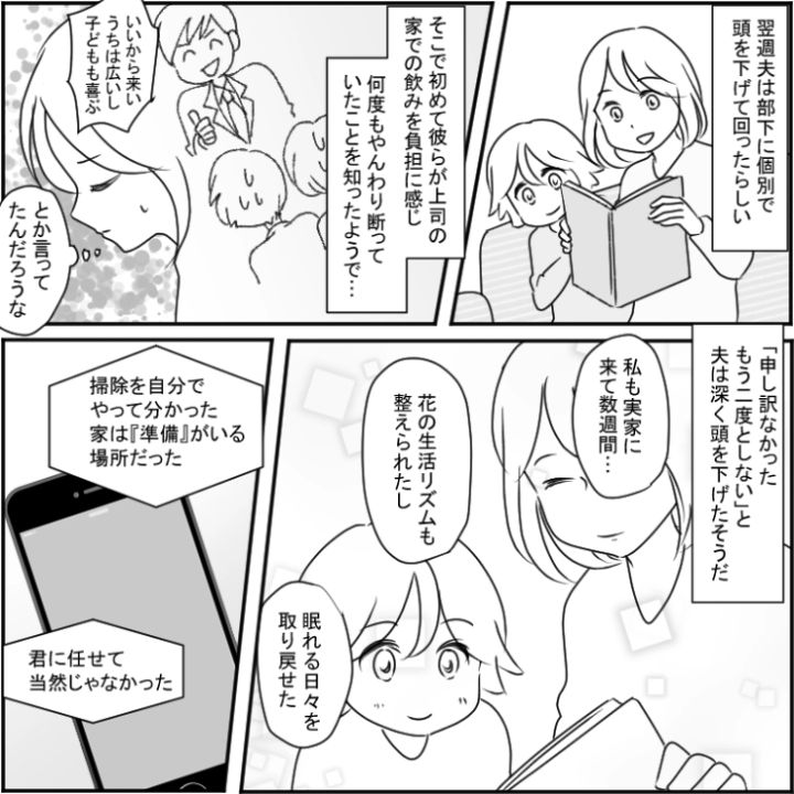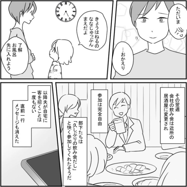さすがにあの一件以降、家に人を呼ぶことはなくなった夫。部下たちも今まではほぼ強制だった飲み会が自由参加になりのびのびとしているようです。