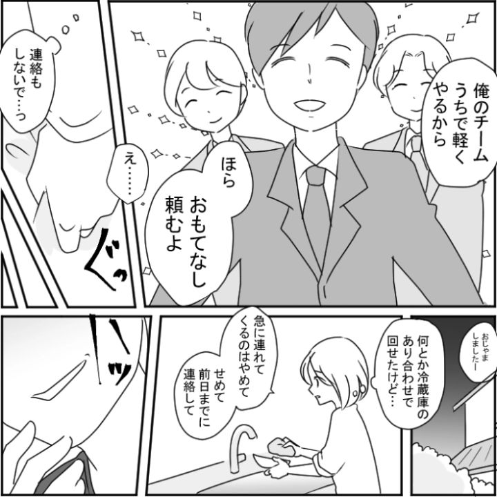 衝撃のエピソードを漫画化!今回はほぼ毎週のように同僚を呼んで宅飲みを開催し、その連絡が直前すぎる夫のお話をご紹介します。
