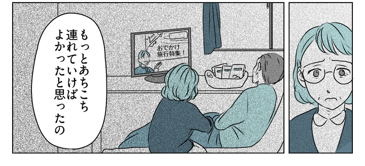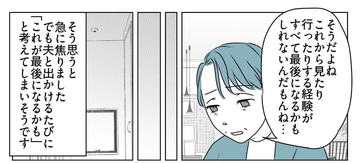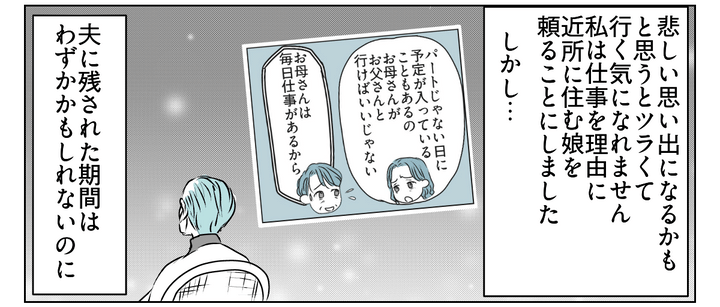 友人のヒロコちゃんが「夫をもっとあちこち連れていけばよかった」と後悔する様子を見て、私は夫を連れ出さねば、という思いを持ちはじめます。しかし外出のたびに「これが最期かも」と思ってしまいそうで、夫との外出を躊躇います。そこで私は娘を頼ることにしたのです。