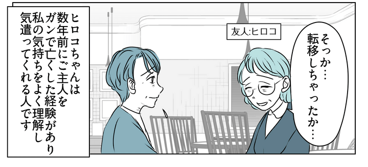 この気持ちを一人で抱え続けるとおかしくなりそうだと思った私は、古くからの友人であり、ご近所さんのヒロコちゃん(60代)に夫のガン転移について話してみました。