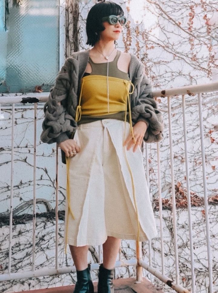 「春を意識したカラーグラデーションのスタイリングへ、アイウェアのグリーンをポイントに取り入れました。個性的なニットアイテムのレイヤードしているので、アイウェアも存在感のあるデザインを選んだのがポイントです」