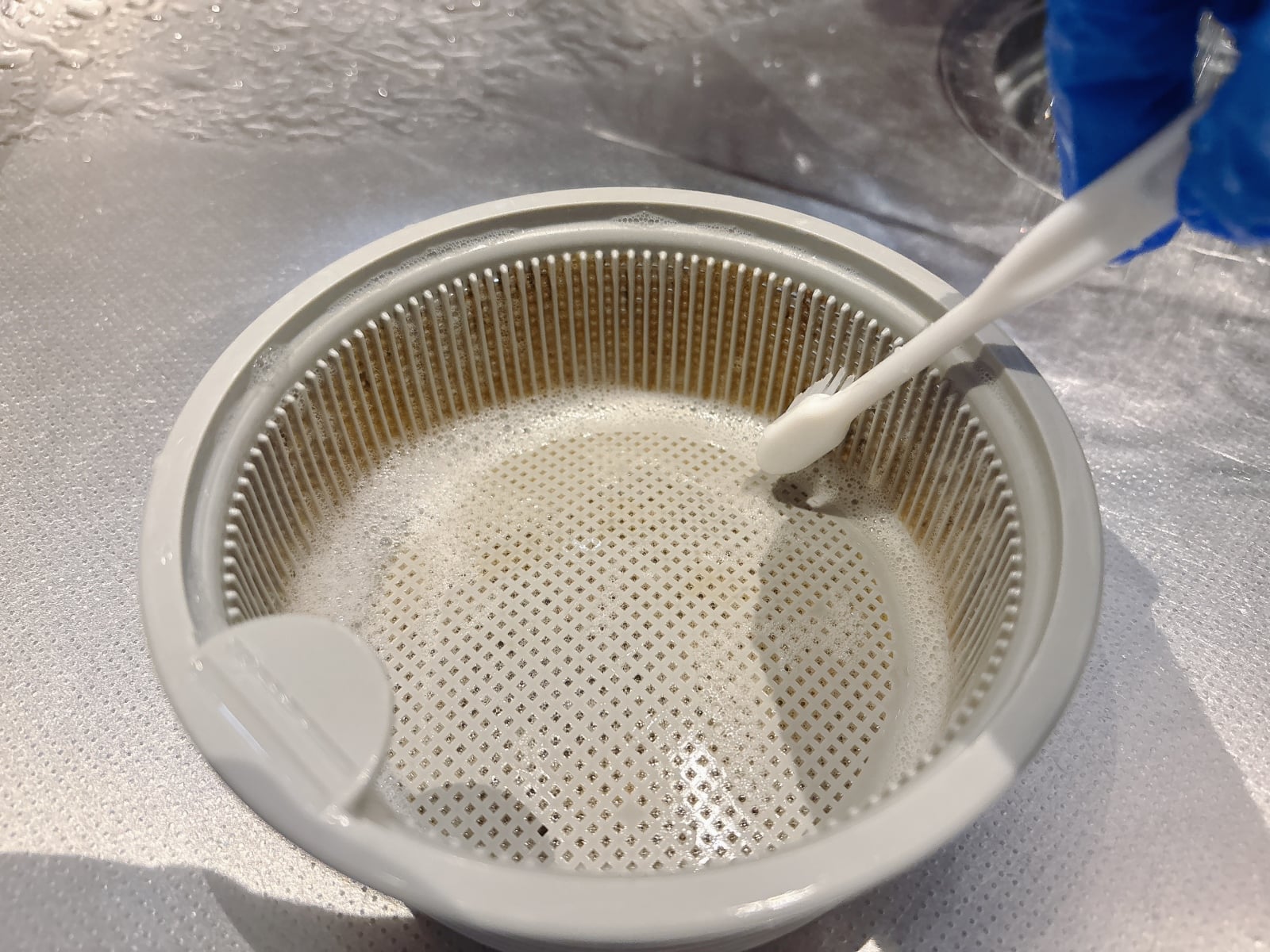 3. “細かい網目に入り込んだヌメリ”を一掃!キッチン排水口の「ゴミ受け黄ばみ」が“スルンと落ちる”掃除術