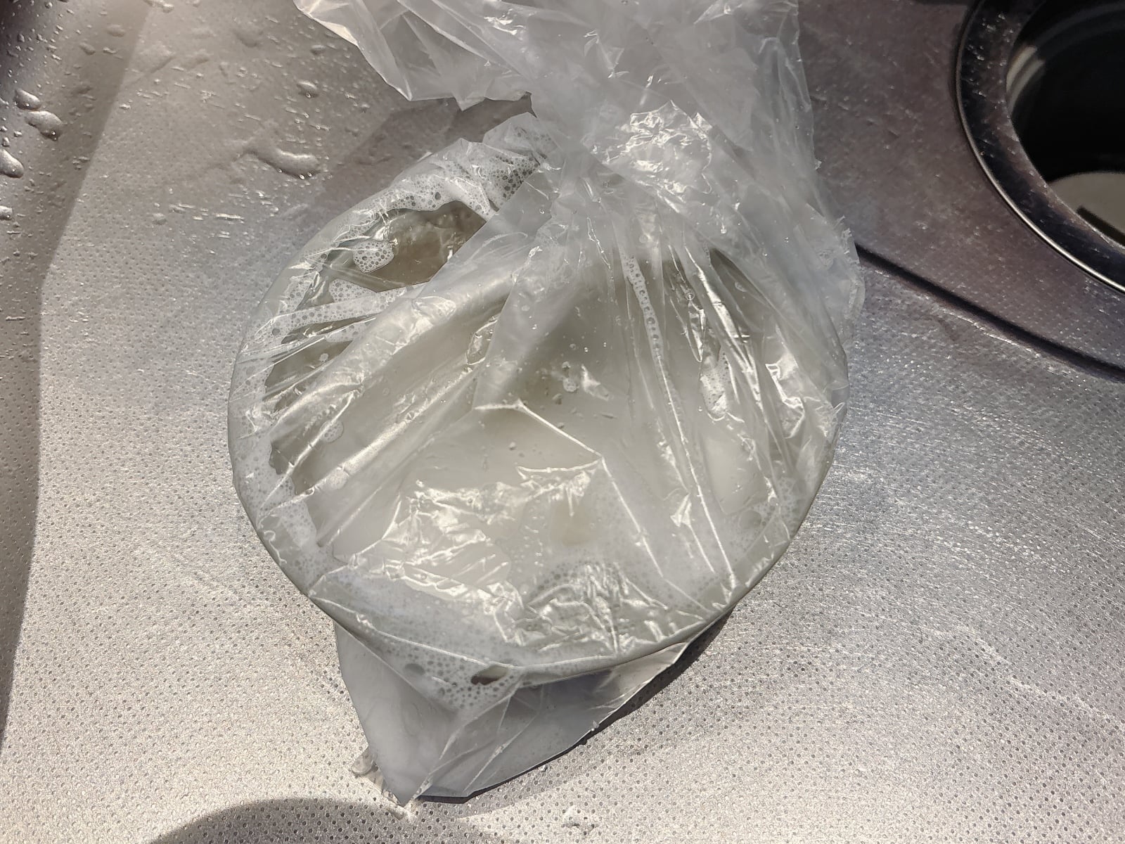 手順2.ポリ袋にゴミ受けを入れ、キッチン泡ハイターをかけます