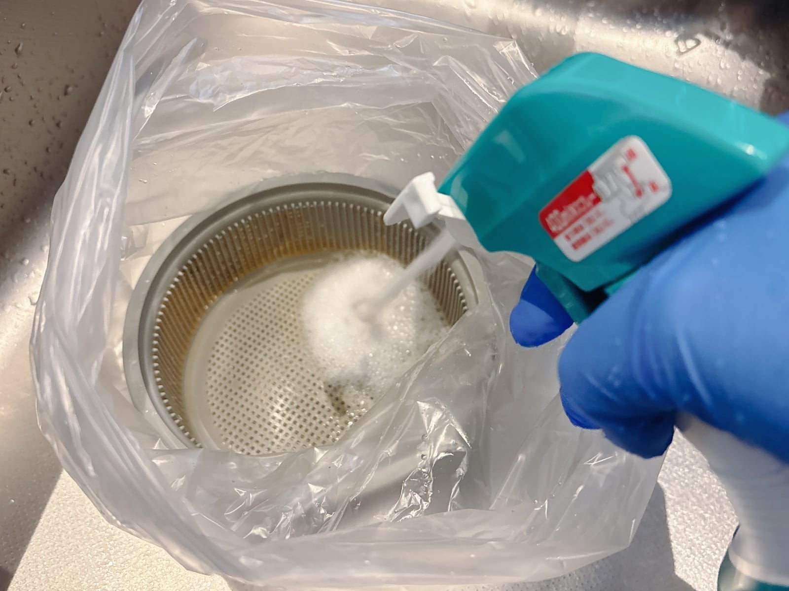 ゴミ受けの網目に溜まった汚れは、こすっただけではすんなり落ちてくれません。そこで今回使うのが、キッチンのお手入れでは定番の「キッチン泡ハイター」。