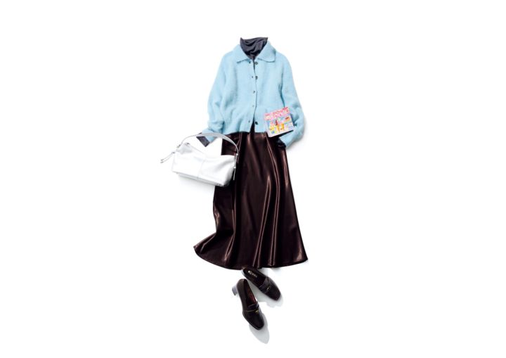 ブルー×ブラウンは今季大注目の色合わせ。キャッチーだけれど甘さは控えめで、大きな会議にもぴったりなんです。ふわニット×つやつやサテンと、素材感にメリハリがあるのも裏ポイント。