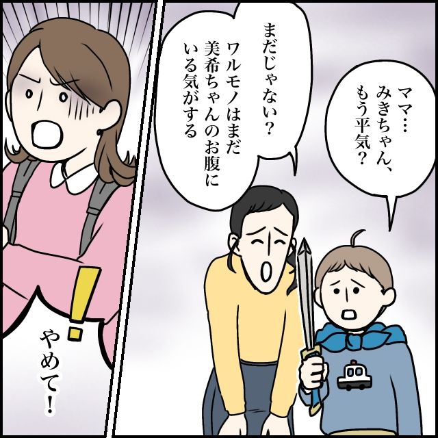 「ママ、みきちゃんもう平気?」不安そうにたずねるれおくんに、玲美さんは「まだじゃない?ワルモノはまだ美希ちゃんのお腹にいる気がする」そう言って、私のお腹を指さしました。まさか、お腹の赤ちゃんを狙うつもり!?私はとっさに「やめて!」と叫びました。
