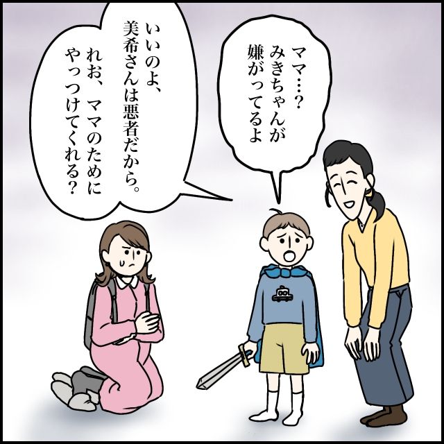 私の必死な形相に驚いたのか、れおくんは声を震わせながら「ママ・・・?みきちゃんが嫌がってるよ」と不安そうに玲美さんを見上げます。しかし、玲美さんは「いいのよ美希さんは悪者だから、ママのためにやっつけてくれる?」と静かに微笑むだけ。