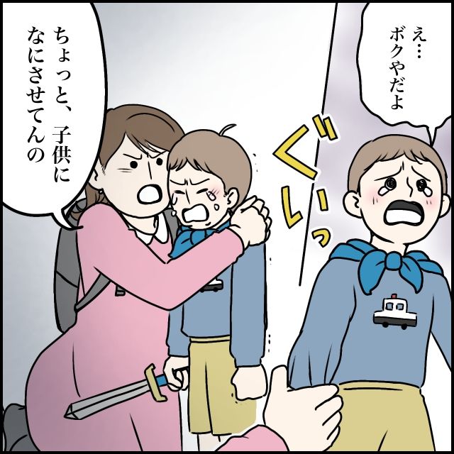 嫌がる相手を攻撃してはいけないと感じたのでしょうか。れおくんは「え・・・ボクやだよ」と声を詰まらせ、泣き出してしまいました。私は咄嗟にれおくんを引き寄せてぎゅっと抱きしめます。そして、玲美さんを強くにらみつけながら「ちょっと、子どもになにさせてんの」言いました。