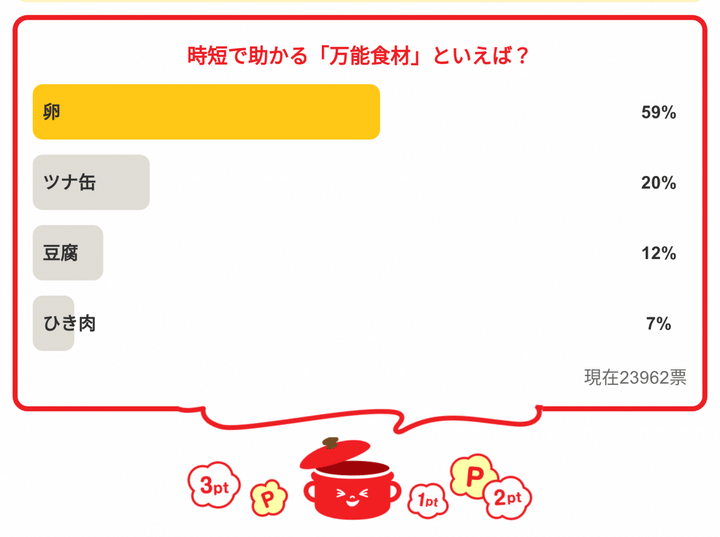 不動の1位は「卵」でした。炒める・和える・のせるだけと使い勝手抜群。冷蔵庫に常備している人が多いのも納得の結果です。