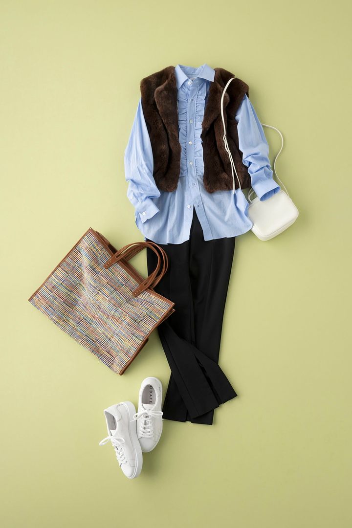 パンツ¥22,000(ルフィル/LE PHIL NEWoMan新宿店)ベスト¥121,000(コルコバード/フィルム)ブラウス¥62,700(セブリン/アマン)バッグ¥44,000(アエタ/スーパー エー マーケット 青山)トートバック¥73,700(ア ヴァケーション/ノーベルバ)スニーカー¥37,400(デイト/ティースクエア プレスルーム)