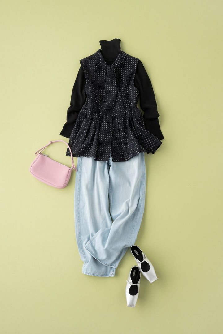 女子会ランチの日は、ほんのり華やぐペプラムジレブラウスが大活躍。凹凸あるドット柄ジャガード差材の立体感あるディテールは、着るだけでコーデに奥行きと品の良さが生まれます。ペプラムシルエットが気になる腰回りをカバーしてくれるのも嬉しいポイント。インは黒タートルで引き締めて甘さを程よくセーブ。ゆるっとデニムでカジュアルダウンして、足元はシルバーパンプスで軽やかな抜け感を。気分も上がるピンクのミニバッグで可愛げをプラスして、大人のきれいめカジュアルスタイルに。