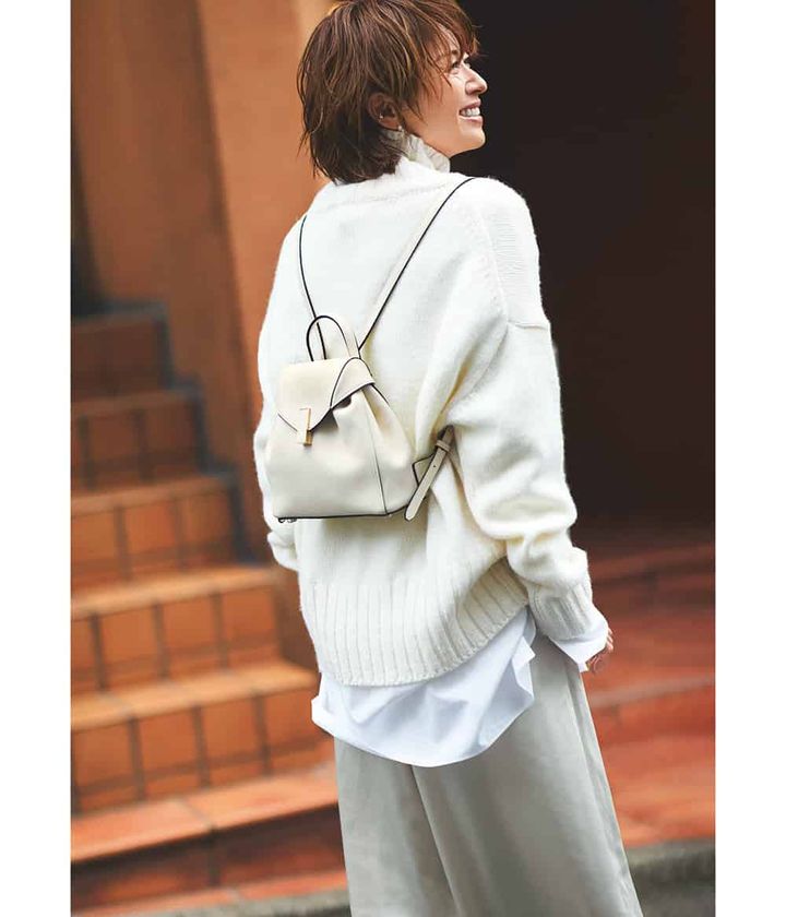 リュック¥396,000(ヴァレクストラ/ヴァレクストラ ジャパン)ニット¥23,100パンツ¥24,200(ともにHER.)シャツ¥30,800(カオス/カオス丸の内)ピアス¥94,600ピアス¥99,000イヤーカフ¥91,300イヤーカフ¥96,800(ともにヒロタカ/ヒロタカ 表参道ヒルズ)
