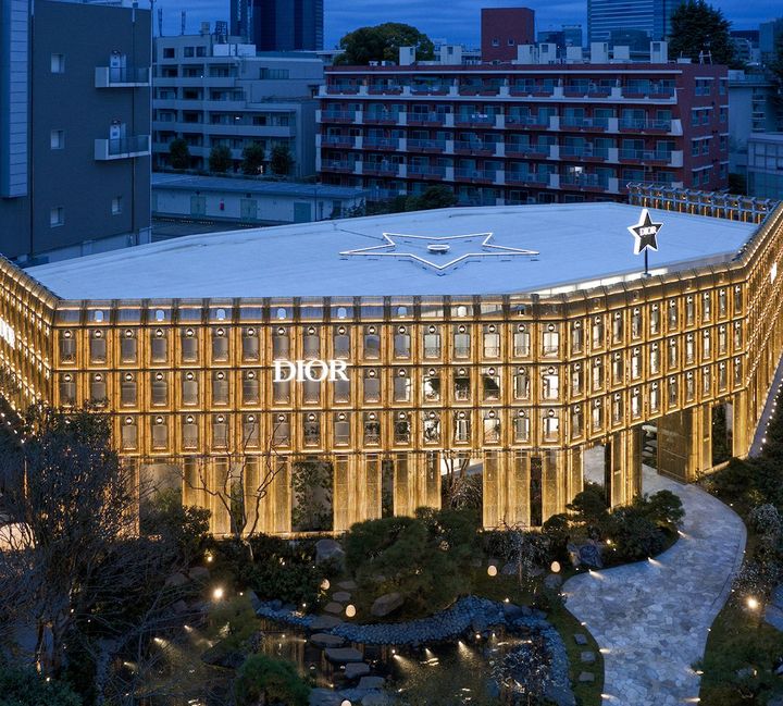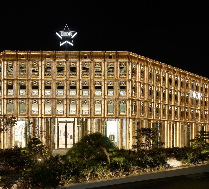 1947年よりメゾンの運命を導いてきた星に見守られる壮麗な建築は、パリ本店「30 モンテーニュ」のファサードをゴールドに染め上げたバンブーで再解釈。日本の竹林に着想を得たセノグラフィーは、夜には幻想的にライトアップされる。