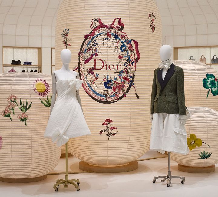 また、スターやヴェルサイユ様式の寄木細工フローリングといったディオールのコードが、日本の職人技と美しく響き合う。天井や壁には和紙が詩情豊かにあしらわれ、繊細なエンボス加工がパリのモールディングを想起させるディテールを演出。さらに、メゾンのアイコン「レディ ディオール」バッグのフォルムを象った提灯が空間に柔らかな光を灯し、TAKT PROJECTや太田翔、柴田あゆみ、we+、光井花、CHIKAKENら現代デザイナーの作品が、随所に繊細なアクセントを添えている。