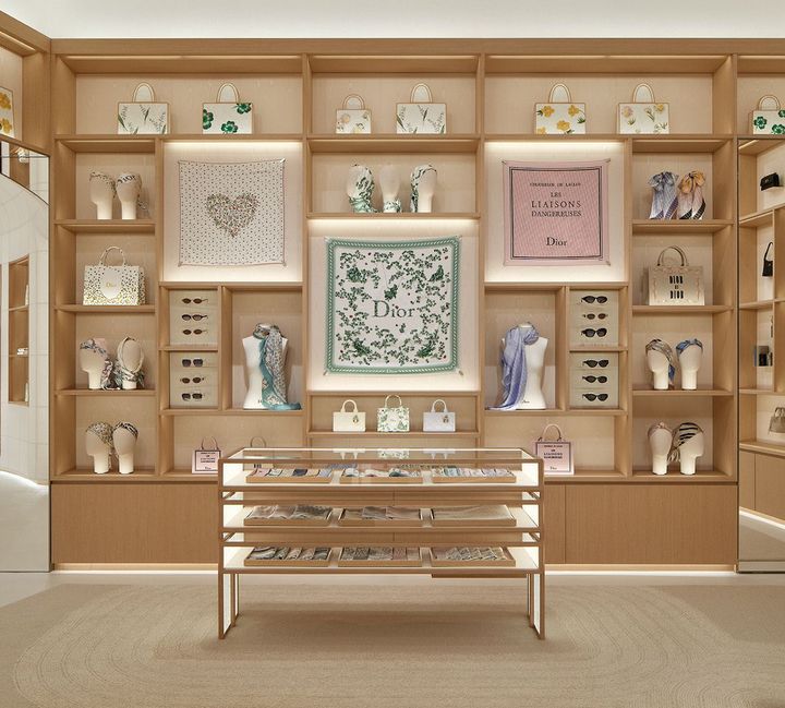空間の随所には、「バー」スーツや「ジュノン」ドレスといったメゾンを象徴するクリエイションも展示。ブティックの枠を超え、ディオールの歴史を体感する場へと昇華している。