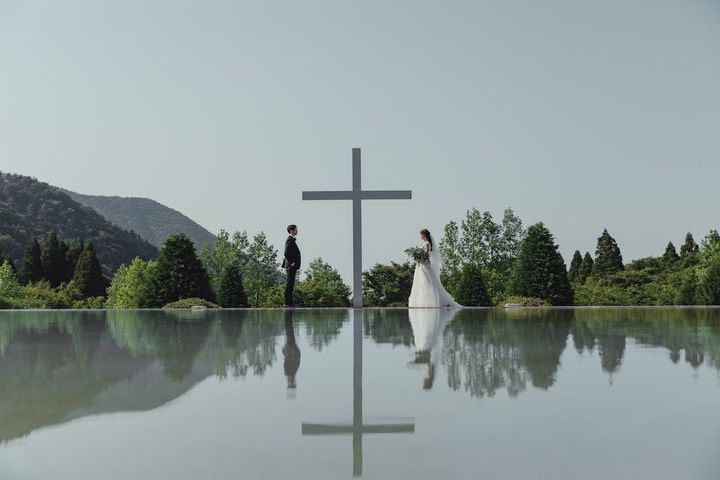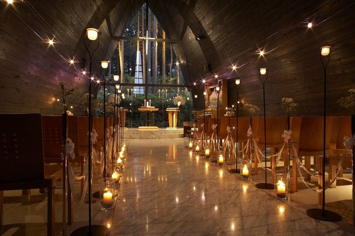 北海道、トマムにある安藤忠雄氏による設計の「水の教会」。深い森の中、自然との共生をテーマに建てられており、建築を通して自然の要素「水・風・光・緑」に触れることができます。着席で最大80名まで列席できます。