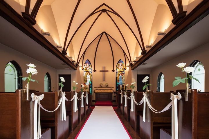 高い天井には優しく光が満ちて、誓いにのぞむふたりを包みます。祭壇の奥にある聖母マリアの受胎告知を描いたステンドグラスが印象的。セレモニーは着席で最大50名までの列席が可能です。